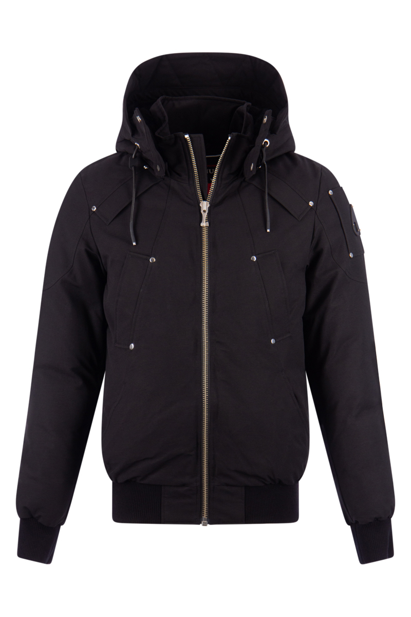 Streamlined bomber jacket with a modern twist from Moose Knuckles. Features a frontal zip closure and a drawstring hood. Includes dual chest pockets with snap-button flaps and additional sleeve pocket. Accented with metallic hardware and logo detail on the left sleeve. Ribbed cuffs and hem add to the structured silhouette.