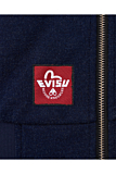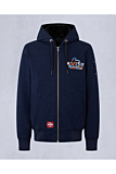 Jacket featuring a relaxed fit with zip closure. Designed in a deep blue hue, it includes a drawstring hood and front pockets. The piece is marked by a collaborative logo on the chest and a signature patch on the pocket. Ribbed cuffs and hem complete the design. Sleeve pocket detail with a branded motif.