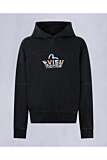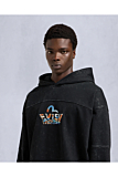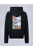 Featuring an oversized fit, this hoodie includes a bold front logo and vibrant back graphic design. The hood is adjustable with a drawstring. Long sleeves with ribbed cuffs and hem for added comfort and style. The black color with distinctive patterns provides a striking appearance, making it versatile for pairing with various pants styles.