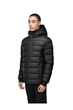 Modern jacket with sleek design. Features a full zip closure and a hood for added protection. Includes side pockets with zippers for secure storage. Subtle logo patch on the sleeve. Ribbed cuffs and straight hem for a clean finish.