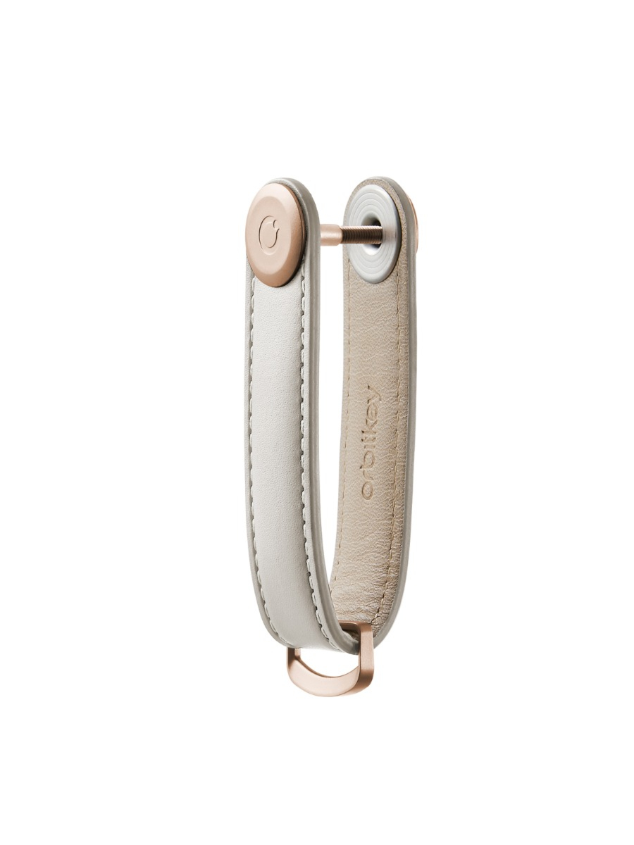 Leather key organizer designed to streamline and manage keys. Compact and minimalist structure. Features a secure locking mechanism and a sleek D-ring for car keys or larger accessories. Product accommodates 2-7 keys. Sophisticated rose gold hardware accents. Discreet embossed branding on the side.