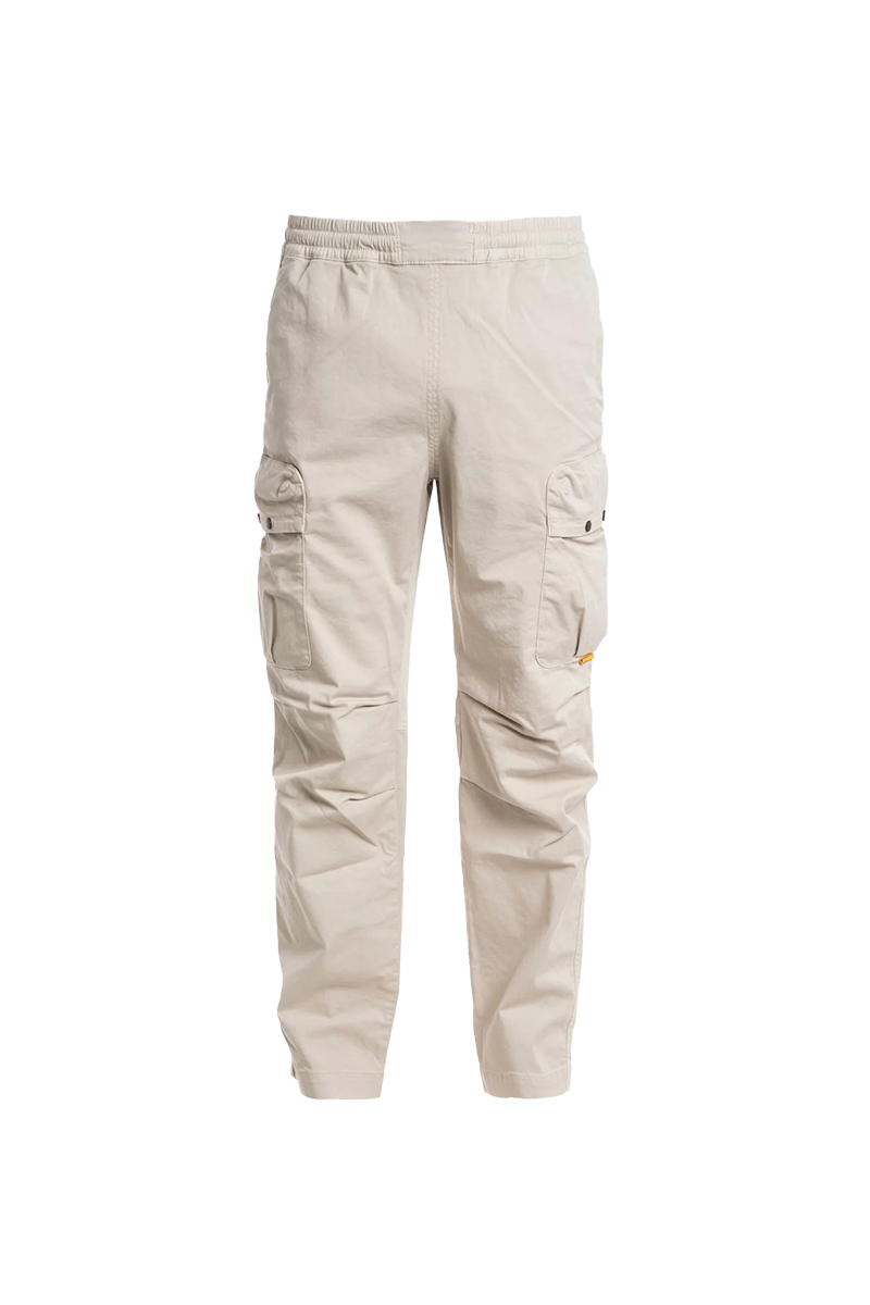 Beige trousers with a relaxed fit and elasticated waistband. Features multiple utility pockets on the sides for practical storage. Button closures on the pockets provide secure access. Subtle brand detailing on the pocket adds a touch of style.