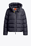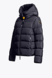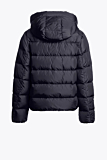 Puffer jacket with quilted design and hood. Features a front zipper closure and two side pockets with zippers. Includes a Parajumpers patch on the sleeve and a distinctive yellow snap closure at the collar. Designed with ribbed cuffs for added protection.