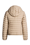 Light brown jacket designed with a quilted pattern and a fitted silhouette. Features a full-zip front closure and a hood for added coverage. Elastic cuffs and hem ensure a snug fit. Discreet Parajumpers branding tab on upper sleeve. Side pockets for practicality.