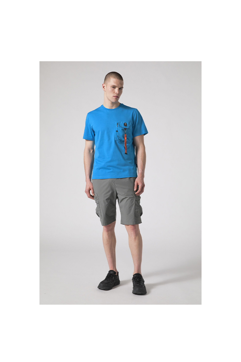 Regular fit T-shirt with crew neck, featuring a unique chest pocket with snap button closure. Functional detailing includes an orange Parajumpers logo strap and a patch logo. The T-shirt presents a practical and stylish approach with a front zip detail adding an extra element of functionality. Short sleeves. Available in a distinctive dark green shade.
