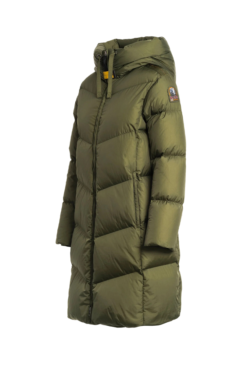 Long padded jacket featuring a sleek zip closure. Hood included, adjustable with long drawstrings. The jacket boasts subtle stitching details, providing a quilted appearance. It includes practical side pockets for convenience. The brand's signature patch is present on the upper sleeve, adding a recognizable detail.