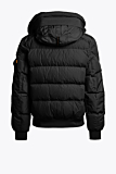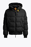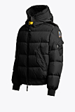 Black jacket with a padded design providing excellent insulation. Features a front zip closure and ribbed cuffs and hem for a secure fit. The jacket is equipped with two side pockets and an additional zip pocket on the sleeve for convenience. Includes an adjustable hood with a distinctive yellow strap detail at the neck, adding a functional and stylish element. The Parajumpers branded patch is displayed on the upper sleeve, showcasing the signature logo. Durable construction designed for lasting wear.