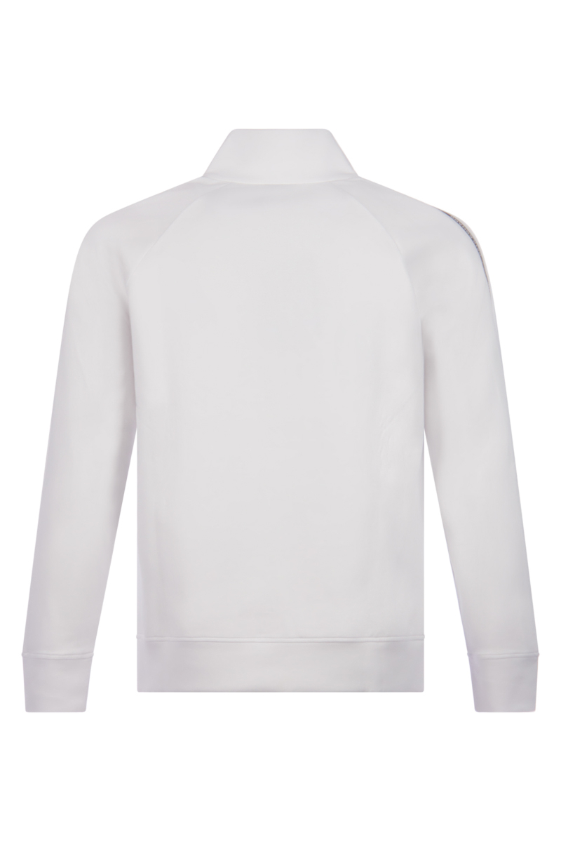 Paul & Shark sweater with full zip closure in a clean white design. Regular fit with ribbed cuffs and hem. Featuring taped logo detailing along the sleeves and a discreet printed logo on the chest. High collar for added style and warmth.