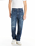 Classic-fit jeans featuring subtle distressing details. Five-pocket design with button and zip fastening. Signature stitching on back pockets. Belt loops and a branded patch on the waistband. Available in a versatile blue wash.
