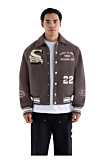 Saint Blanc Jacket – Presented Varsity Brown Varsity jacket with button closure. Features embroidered logos and patches. Includes ribbed cuffs and hem. Two hand pockets and a classic collar.