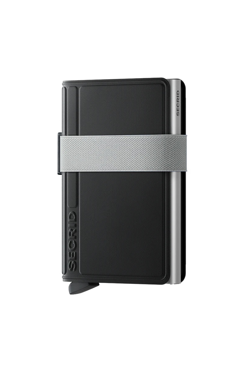 A sleek wallet with an innovative design by Secrid. The band wallet combines functionality with a slim profile. It features a sturdy strap closure and space for multiple cards and banknotes. It has a sleek finish and subtle branding on the side.