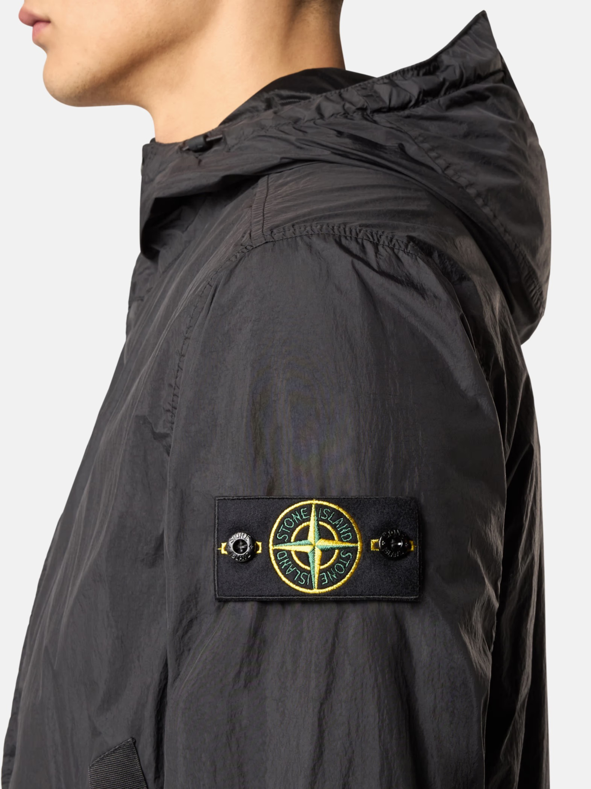 Functional jacket featuring a classic design with a subtle sheen. Includes a full zip closure and snap buttons. Hooded for additional coverage. Two spacious side pockets. Iconic Stone Island badge on the sleeve. The versatile black color suits various ensembles. Ideal for layering during colder days.