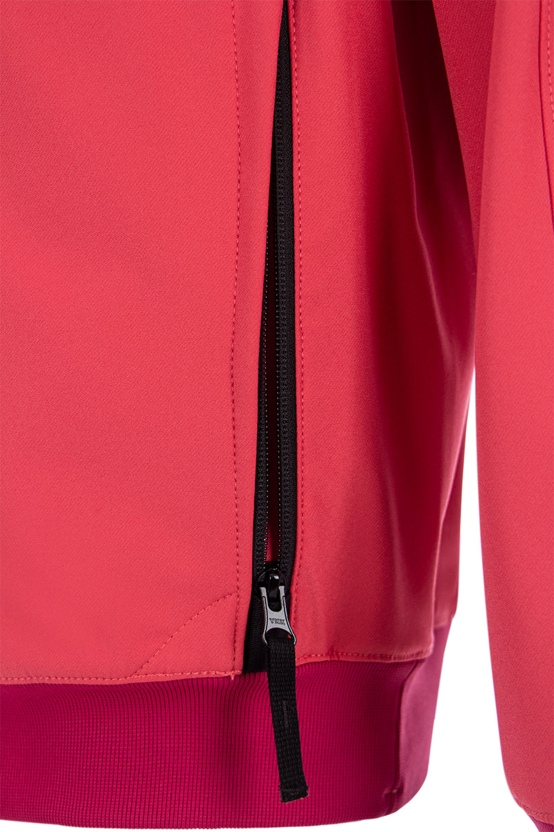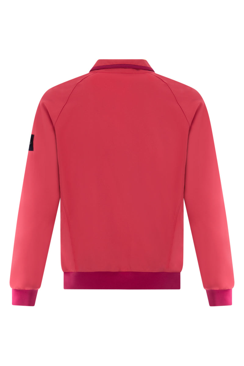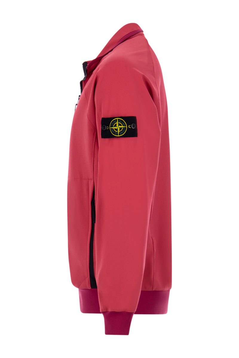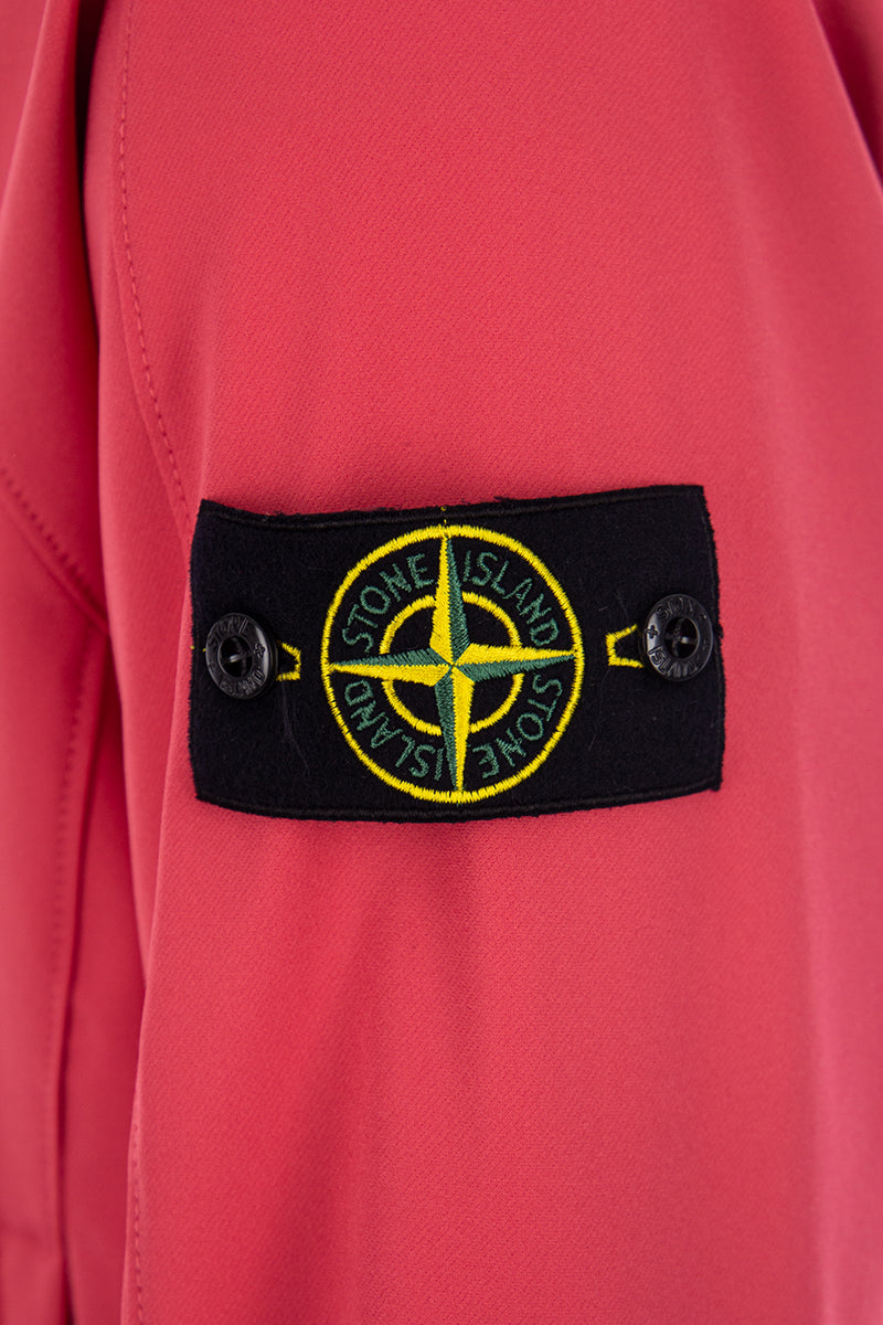 Men's softshell jacket in V0087 Fuchsia, from the popular brand Stone Island. The jacket features two zippered pockets on the front and elastic cuffs for extra comfort in any weather. The jacket is finished with the iconic Stone Island patch on the left sleeve. Finally, the jacket features decorative seams along the shoulders.
