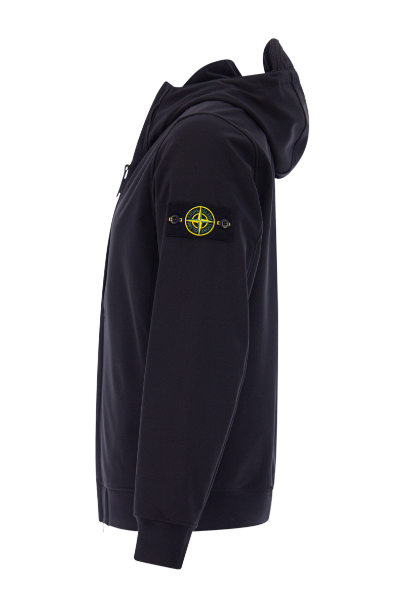 Hooded jacket featuring a sleek design with zippered front. Tailored fit with fine detailing. Adjustable drawstring hood, ribbed cuffs, and hem for added comfort. Iconic Stone Island logo patch on the sleeve. Versatile black color, suitable for casual layering.
