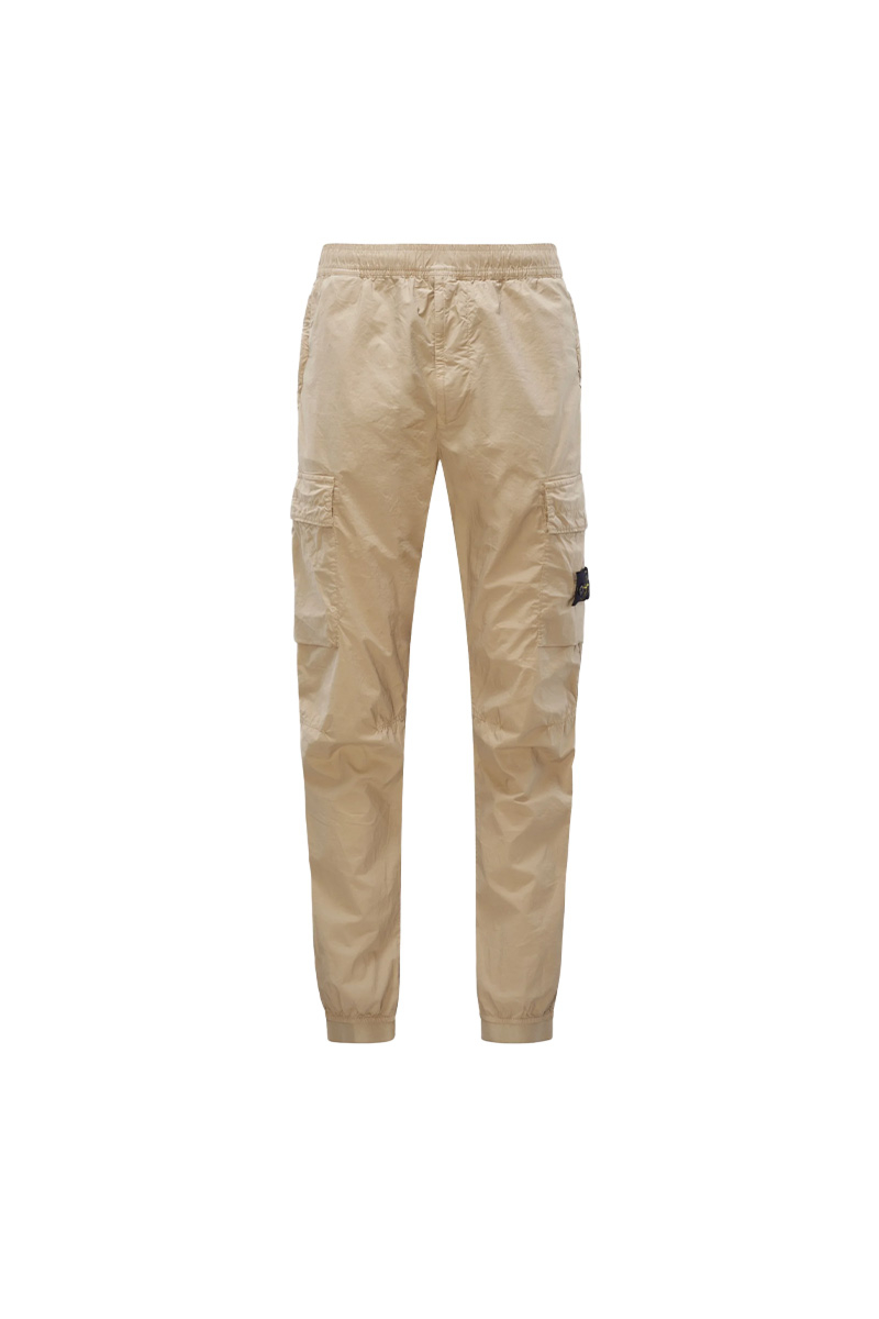 Utility-focused trousers in neutral beige. Features a relaxed fit with elastic waistband for added comfort. Multiple cargo pockets offer practicality and style. Signature Stone Island logo patch on left pocket. Tapered design with elasticated cuffs for a streamlined look.