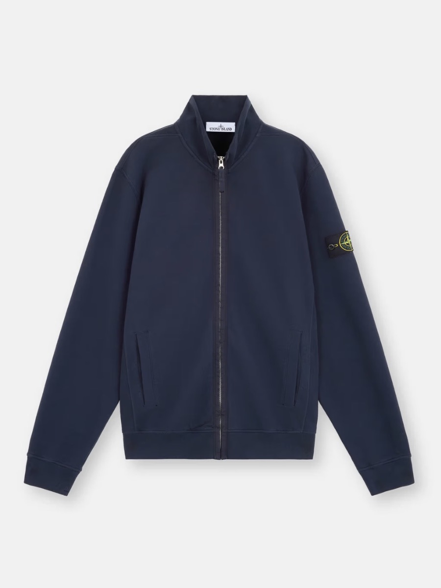 Stone Island sweater featuring a modern design in a versatile dark blue. Regular fit with ribbed cuffs and hem for durability. Full-length zipper closure. High collar for added warmth. Features the iconic Stone Island logo on the left sleeve. Discreet side pockets for functionality.