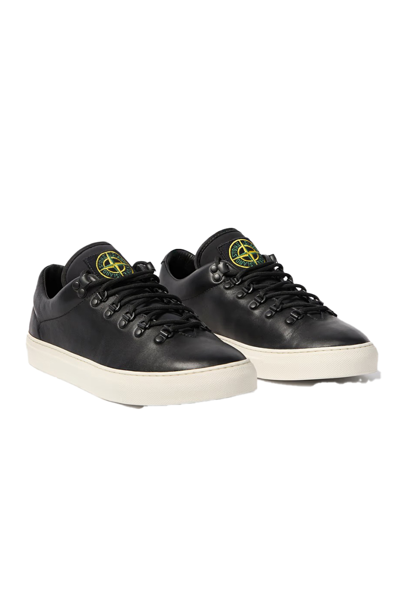Sneakers featuring a sleek black design with subtle logo accents. This pair offers standard lacing and a cushioned collar for added comfort. The white sole contrasts sharply with the upper, providing a modern touch. Stone Island branding is prominently detailed on the tongue. Suitable for pairing with casual or semi-formal attire.