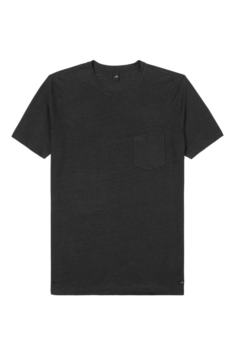 Classic fit T-shirt with a minimalist design. Crew neck and short sleeves. Front pocket for subtle detail. Small stitched logo at the hem. Versatile, deep black color.
