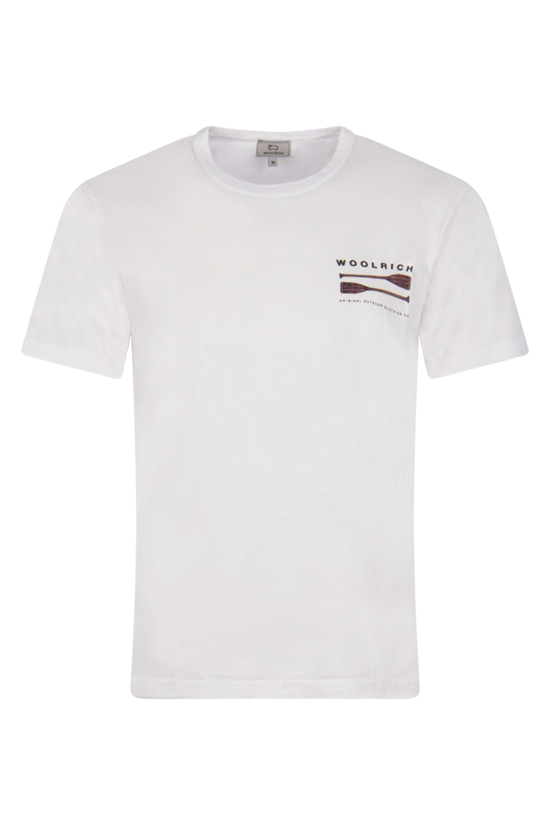Classic T-shirt featuring a casual fit and crew neck. Short sleeves. Front and back printed graphics with a canoe theme. Woolrich branding on the chest. Color: White. Ideal for pairing with jeans or shorts.