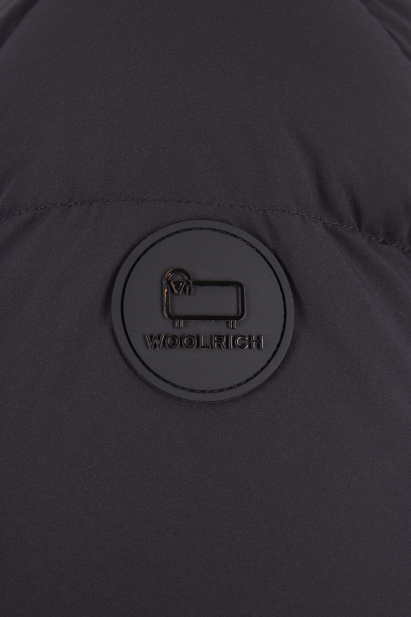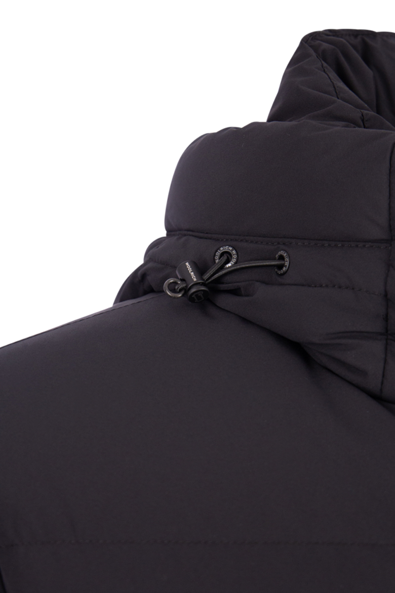 Quilted jacket with a contemporary silhouette. Features a high neck and adjustable hood for added protection against the elements. Full-length zipper closure for ease of wear. Includes two front zip pockets for secure storage. Embroidered Woolrich logo on the sleeve. Padded for extra warmth.