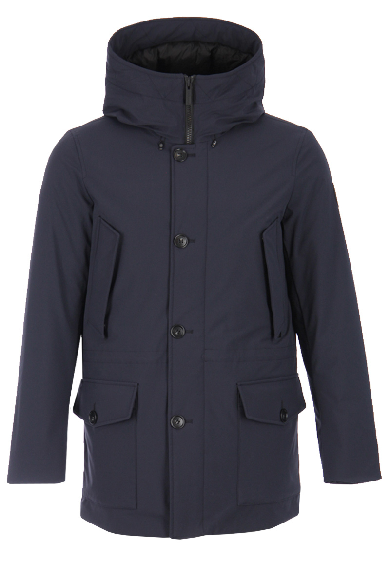 Tailored parka with full-length zipper and button closure. Features a built-in hood for added protection. Multiple flap pockets provide practical storage options. The minimalist design is complemented by the discreet brand patch on the sleeve. Wind-resistant finish.
